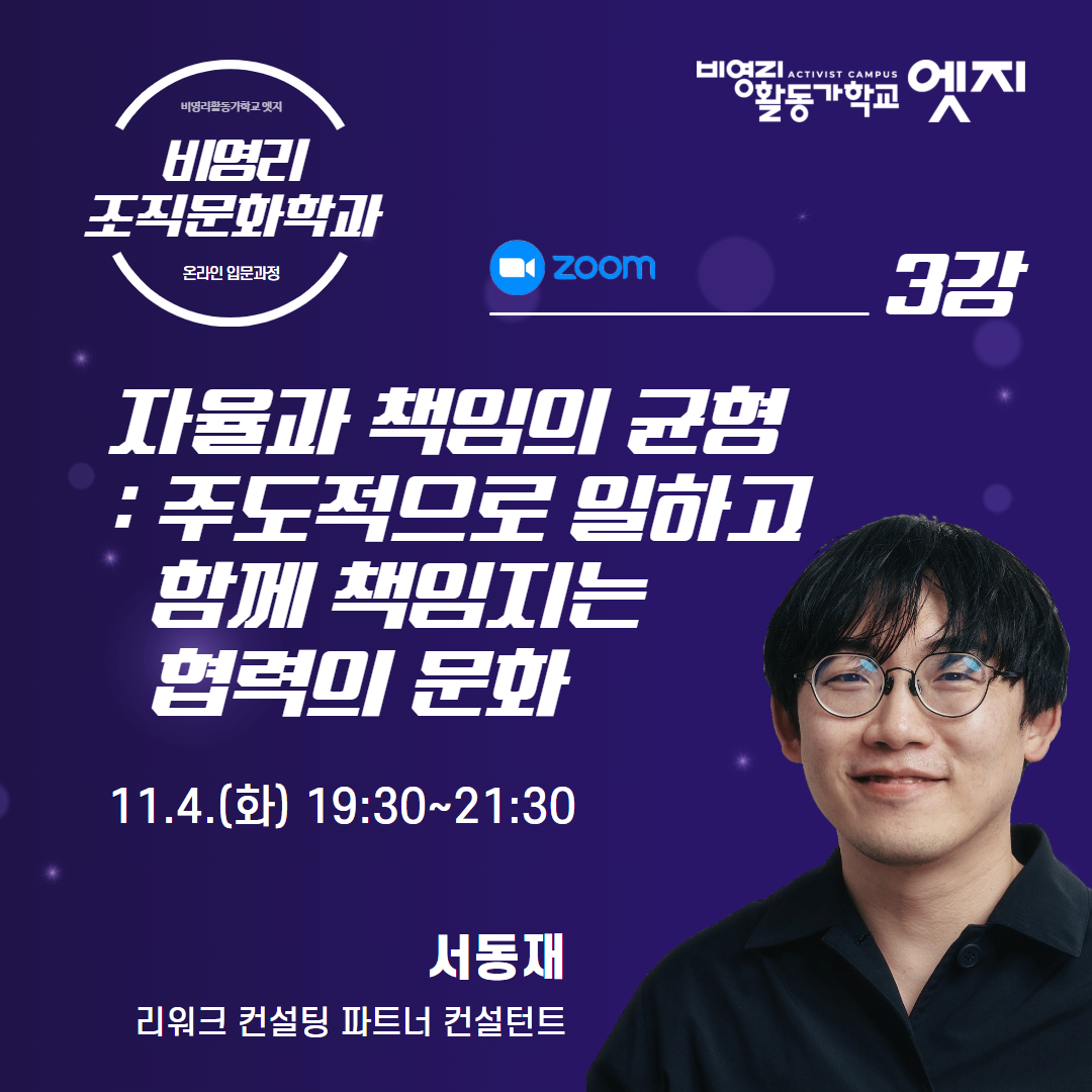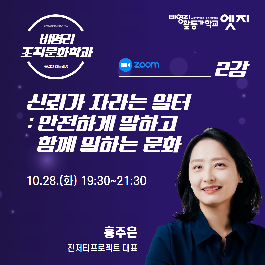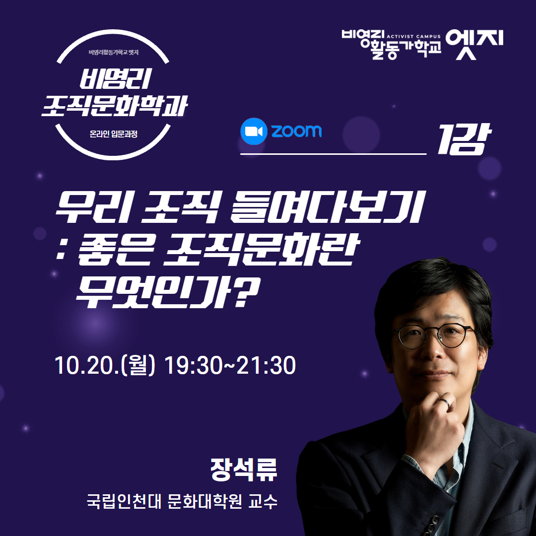온라인 Zoom강의를 통해 비영리 조직문화에 관한 기본을 이해하고, 이후 조직문화 워크숍과 책읽기과정에도 함께 해보세요.